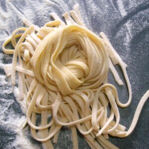 - To prevent your fettuccine from sticking, dust them with semolina flour, using a sweeping motion as seen in the picture.