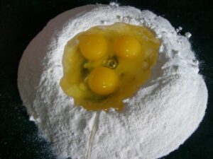 - On a clean work surface, combine the semolina flour, all-purpose flour and salt.