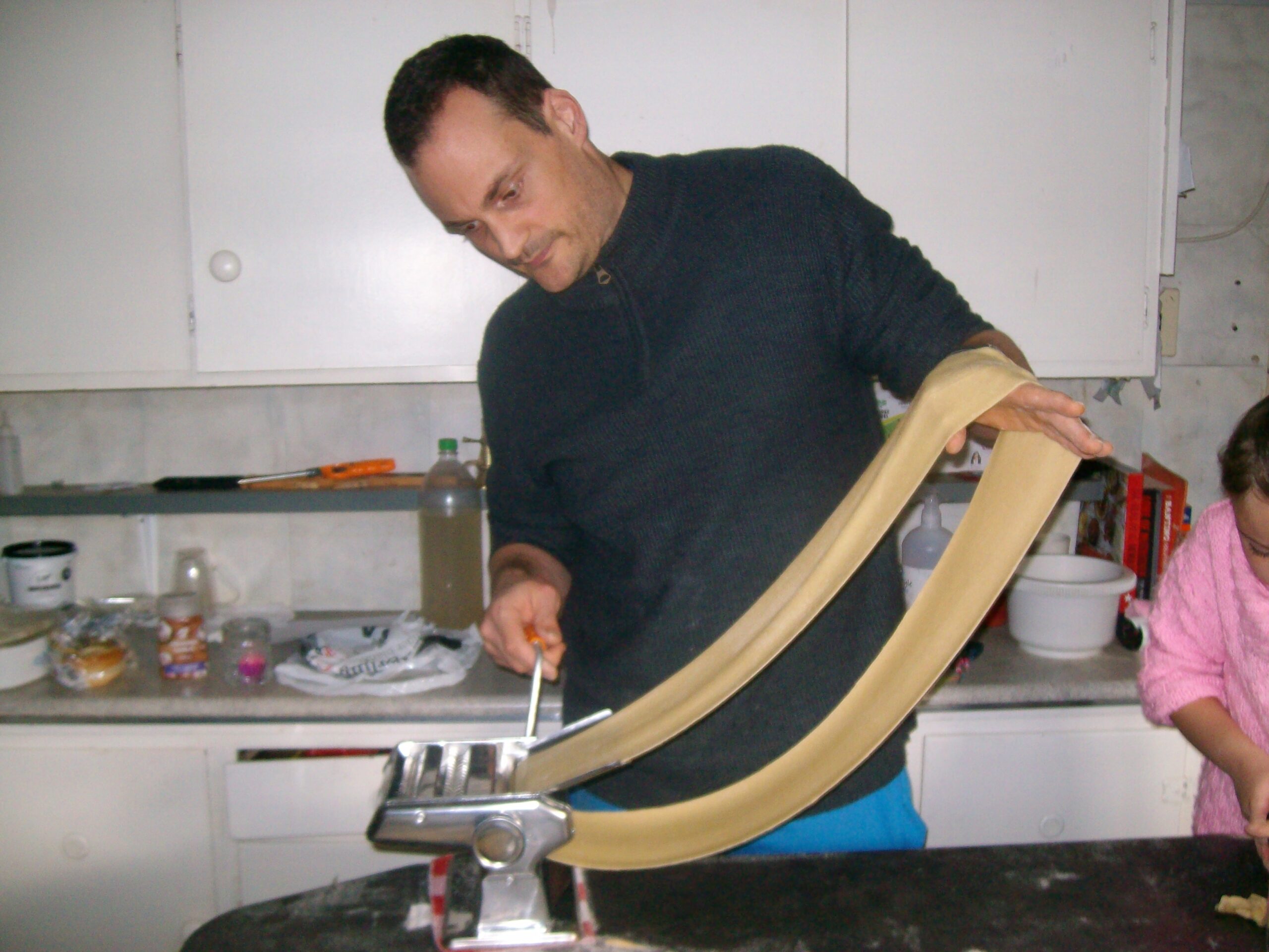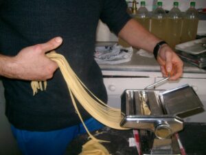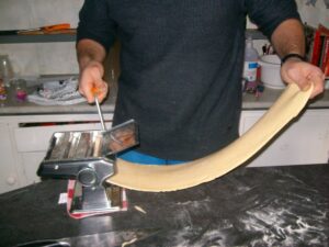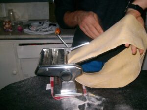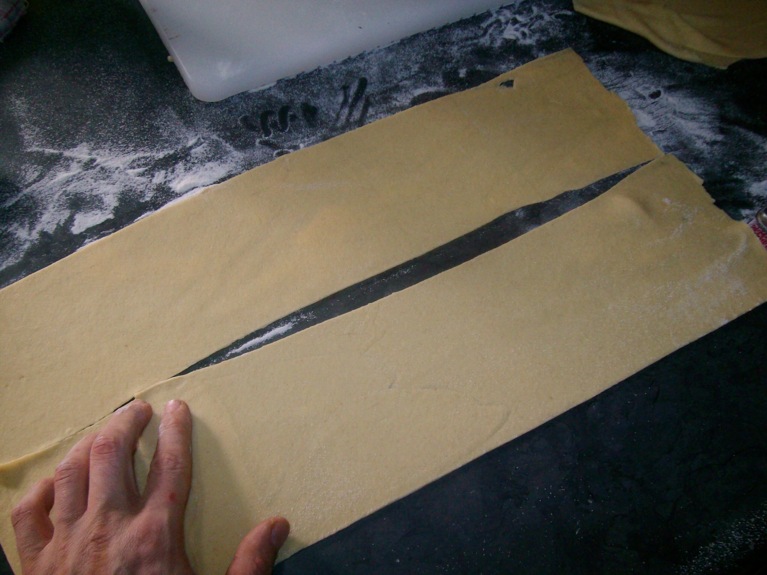 - Dust the sheets with semolina flour and run them through the fettuccine cutter.