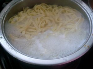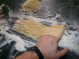 - To prevent your fettuccine from sticking, dust them with semolina flour, using a sweeping motion as seen in the picture.