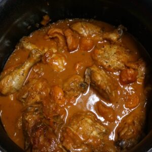 - As soon as the stew reaches a boil, lift it off the coals with a potjie stand. From this point onwards, the stew must simmer slowly. Cook for about 40 minutes or until the chicken is tender.