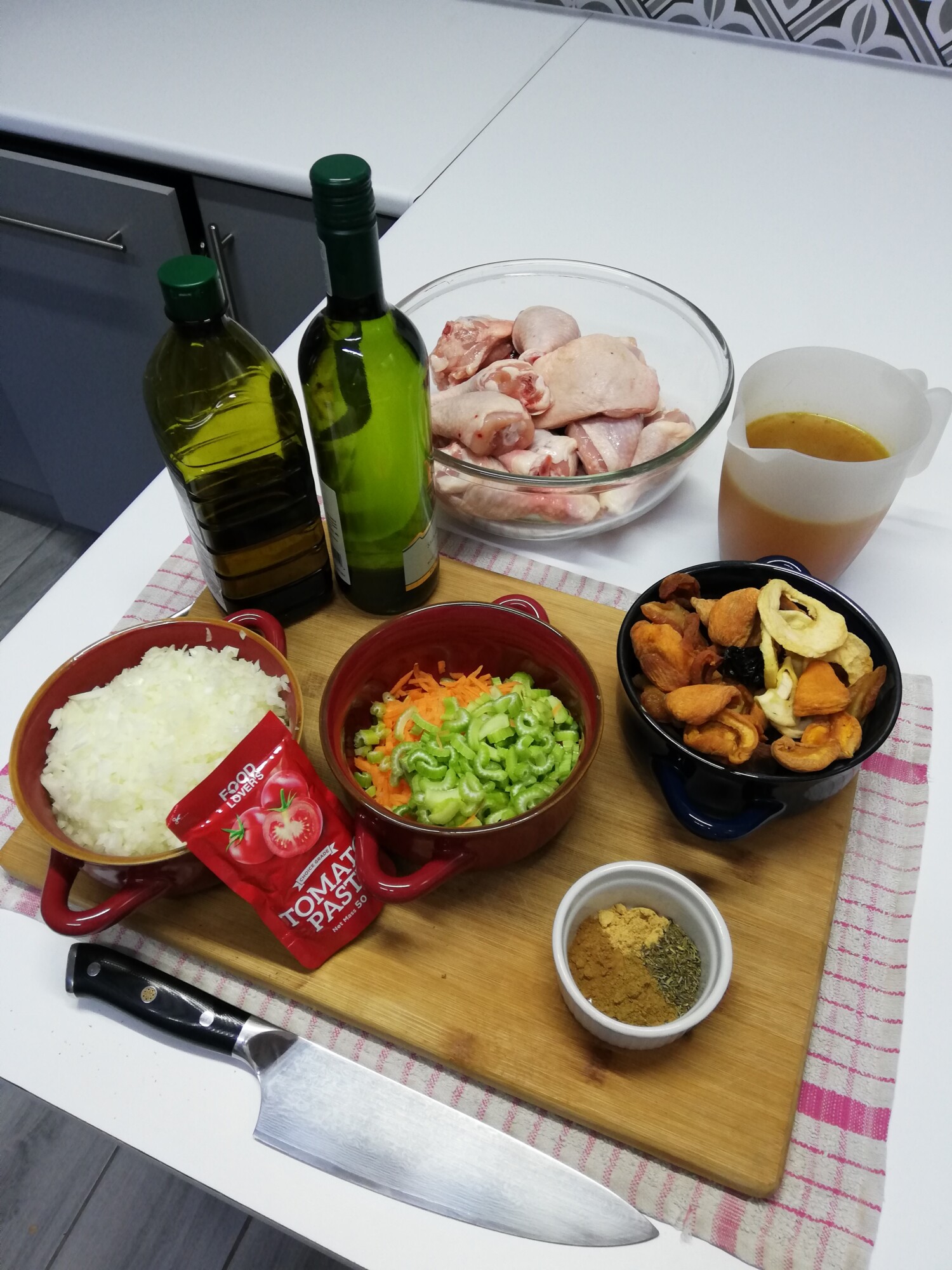 - Start by soaking the dried fruit in the chicken stock.